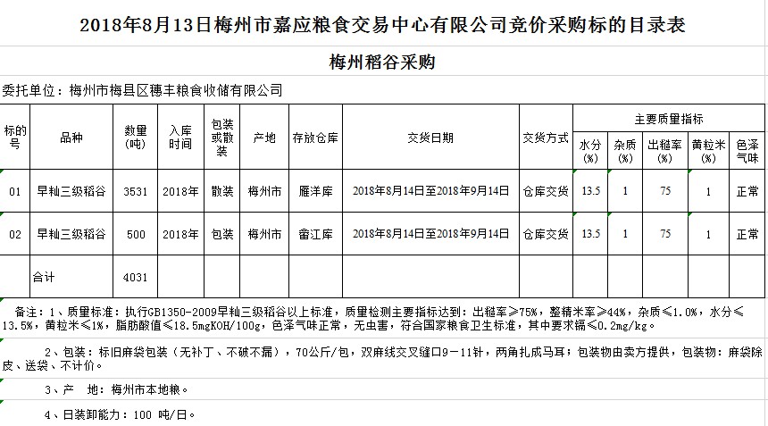 受客戶委托,梅州市嘉應(yīng)糧食交易中心有限公司定于2018年8月13日(星期一)舉辦糧食競價(jià)交易會,梅州市梅縣區(qū)穗豐糧食收儲有限公司擬采購2018年早秈稻4031噸。