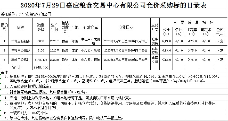 受客戶委托,梅州市嘉應(yīng)糧食交易中心有限公司定于2020年7月29日(星期三)舉辦糧食競價交易會,興寧市糧食收儲公司擬采購2020年早秈稻9248.406噸。