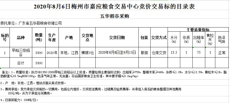 受客戶委托,梅州市嘉應糧食交易中心有限公司定于2020年8月6日(星期四)舉辦糧食競價交易會,廣東省五華縣糧食收儲公司擬采購2020年早秈稻3300噸。