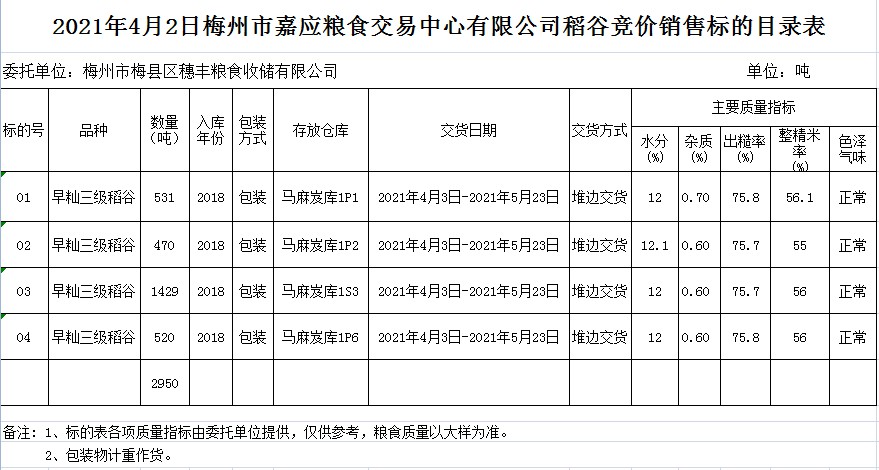 受客戶委托,梅州市嘉應糧食交易中心有限公司定于2021年4月2日(星期五)舉辦糧食競價交易會。梅州市梅縣區穗豐糧食收儲有限公司擬銷售2018年早秈稻2950噸。