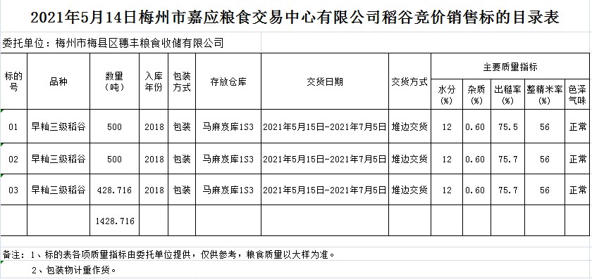 受客戶委托,梅州市嘉應糧食交易中心有限公司定于2021年5月14日(星期五)舉辦糧食競價交易會。梅州市梅縣區穗豐糧食收儲有限公司擬銷售2018年早秈稻1428.716噸。