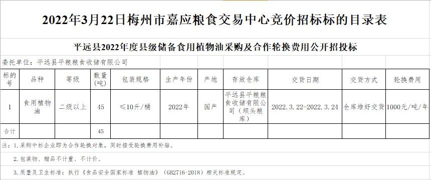 受客戶委托,梅州市嘉應糧食交易中心有限公司定于2022年3月22日(星期二)上午10時在廣東省梅州市彬芳大道南161號梅州市糧食交易中心3樓,舉辦平遠縣縣級食用植物油儲備采購及合作輪換費公開招標。
