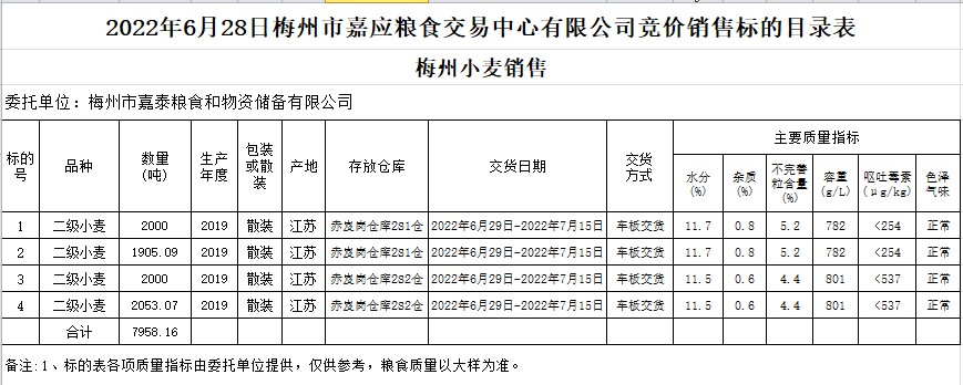 受客戶委托,梅州市嘉應糧食交易中心有限公司定于2022年6月28日(星期二)舉辦糧食競價交易會。梅州市嘉泰糧食和物資儲備有限公司擬銷售2019年小麥7958.16噸。