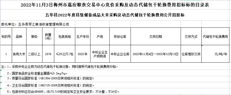 五華縣2022年縣級成品糧采購及動態(tài)代儲包干輪換費用公開招標(biāo)公告