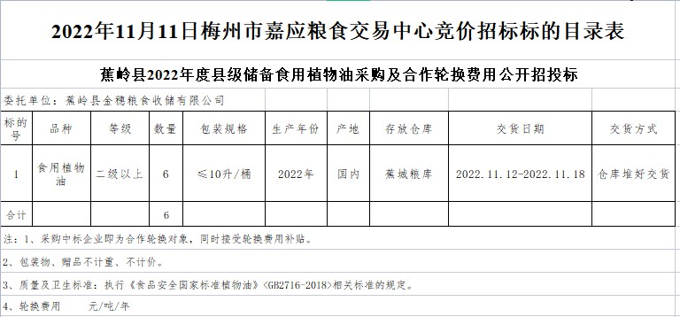 蕉嶺縣2022年度縣級(jí)儲(chǔ)備食用植物油采購及合作輪換費(fèi)用公開招投標(biāo)公告