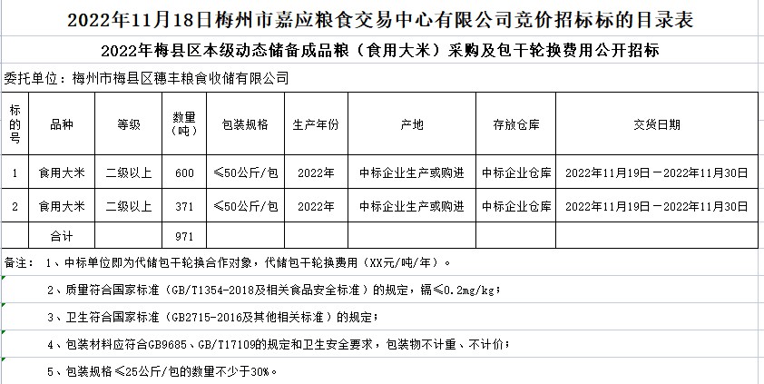 受客戶委托,梅州市嘉應糧食交易中心有限公司定于2022年11月18日(星期五)上午10時在廣東省梅州市彬芳大道南161號梅州市糧食交易中心3樓,舉辦梅縣區本級成品糧動態儲備代儲采購及包干輪換公開招標。