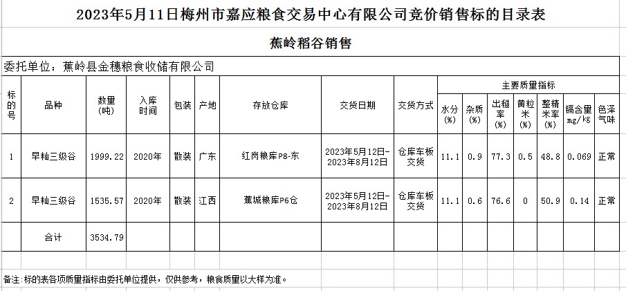受客戶委托,梅州市嘉應(yīng)糧食交易中心有限公司定于2023年5月11日(星期四)舉辦糧食競價交易會。蕉嶺縣金穗糧食收儲有限公司擬銷售2020年早秈稻3534.79噸。