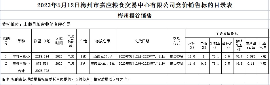 受客戶委托,梅州市嘉應(yīng)糧食交易中心有限公司定于2023年5月12日(星期五)舉辦糧食競(jìng)價(jià)交易會(huì)。豐順縣糧食收儲(chǔ)有限公司擬銷售2020年早秈稻3095.728噸。