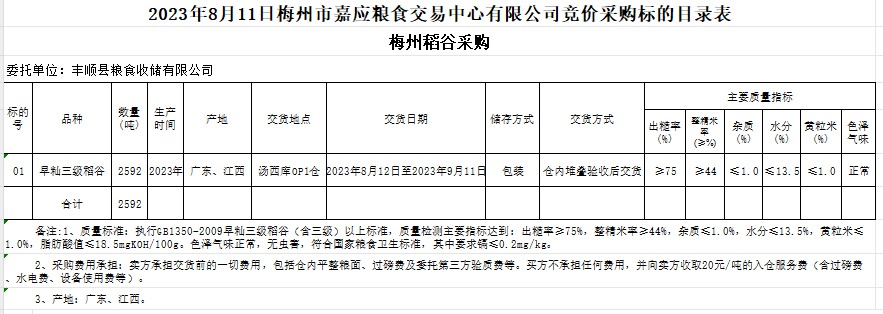 受客戶委托,梅州市嘉應糧食交易中心有限公司定于2023年8月11日(星期五)舉辦糧食競價交易會。豐順縣糧食收儲有限公司擬采購2023年早秈稻2592噸。