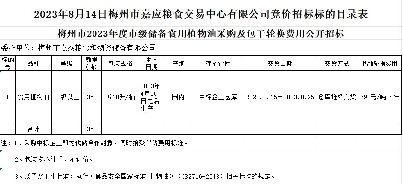 受梅州市嘉泰糧食和物資儲(chǔ)備有限公司委托,梅州市嘉應(yīng)糧食交易中心有限公司定于2023年8月14日(星期一)上午10時(shí)15分舉辦梅州市市級(jí)儲(chǔ)備食用植物油采購(gòu)及包干輪換費(fèi)用公開(kāi)招標(biāo)。