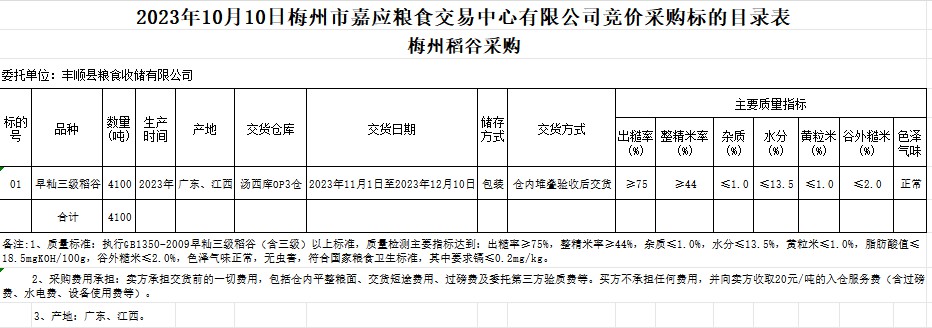 受客戶委托,梅州市嘉應糧食交易中心有限公司定于2023年10月10日(星期二)舉辦糧食競價交易會。豐順縣糧食收儲有限公司擬采購2023年早秈稻谷4100噸。