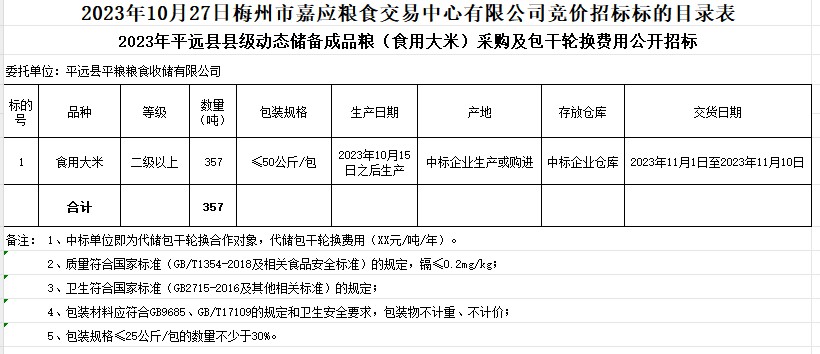 受客戶委托,梅州市嘉應糧食交易中心有限公司定于2023年10月27日(星期五)上午10時在廣東省梅州市彬芳大道南161號梅州市糧食交易中心3樓,舉辦平遠縣縣級成品糧采購及包干輪換費用公開招標。