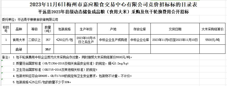 受客戶委托,梅州市嘉應糧食交易中心有限公司定于2023年11月6日(星期一)上午10時在廣東省梅州市彬芳大道南161號梅州市糧食交易中心3樓,舉辦平遠縣2023年縣級動態儲備成品糧(食用大米)采購及包干輪換費用公開招標。