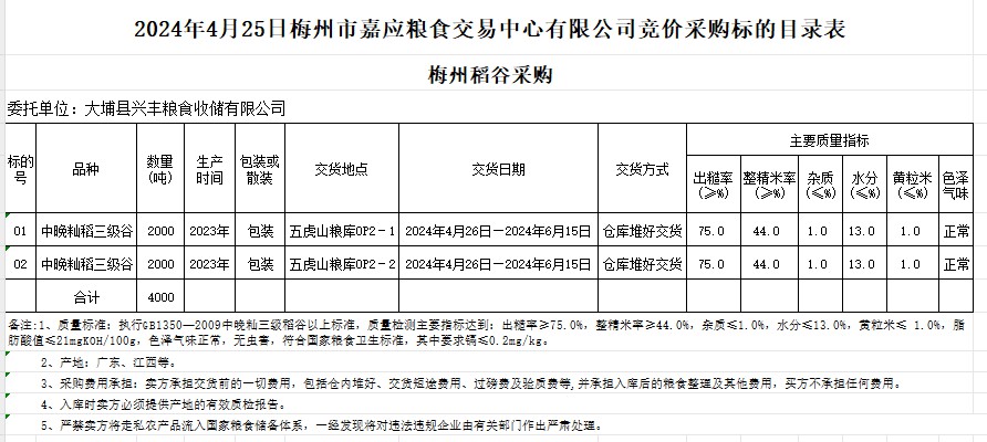 受客戶委托,梅州市嘉應糧食交易中心有限公司定于2024年4月25日(星期四)舉辦糧食競價交易會。大埔縣興豐糧食收儲有限公司擬采購2023年產中晚秈稻谷4000噸。