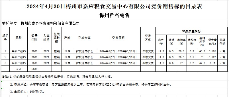 受客戶委托,梅州市嘉應糧食交易中心有限公司定于2024年4月30日(星期二)舉辦糧食競價交易會。梅州市嘉泰糧食和物資儲備有限公司擬銷售2021年早秈稻5600噸。