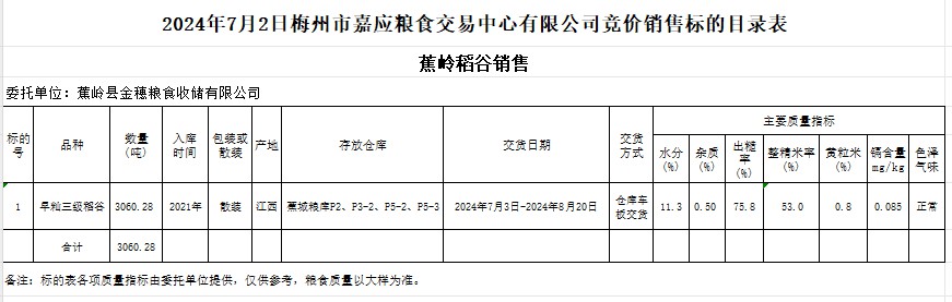 受客戶委托,梅州市嘉應糧食交易中心有限公司定于2024年7月2日(星期二)舉辦糧食競價交易會。蕉嶺縣金穗糧食收儲有限公司擬銷售2021年產早秈稻谷3060.28噸。