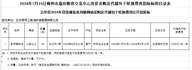受客戶委托,梅州市嘉應糧食交易中心有限公司定于2024年7月19日(星期五)上午10時在廣東省梅州市彬芳大道南161號梅州市糧食交易中心3樓,舉辦五華縣2024年縣級儲備食用植物油采購及代儲包干輪換費用公開招投標。