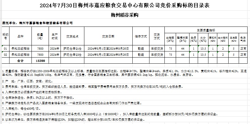 受客戶委托,梅州市嘉應(yīng)糧食交易中心有限公司定于2024年7月30日(星期二)舉辦糧食競價交易會。梅州市嘉泰糧食和物資儲備有限公司擬采購2024年產(chǎn)早秈稻15200噸。