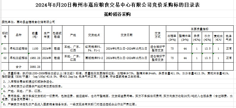 受客戶委托,梅州市嘉應(yīng)糧食交易中心有限公司定于2024年8月20日(星期二)舉辦糧食競價(jià)交易會。蕉嶺縣金穗糧食收儲有限公司擬采購2024年產(chǎn)早秈稻3060.28噸。