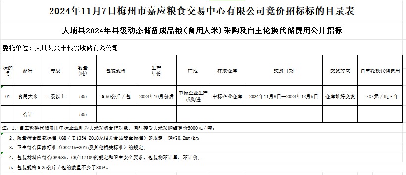 受客戶委托,梅州市嘉應糧食交易中心有限公司定于2024年11月7日(星期四)上午10時在廣東省梅州市彬芳大道南161號梅州市糧食交易中心3樓,舉辦大埔縣2024年縣級動態儲備成品糧(食用大米)采購及自主輪換代儲費用公開招標。