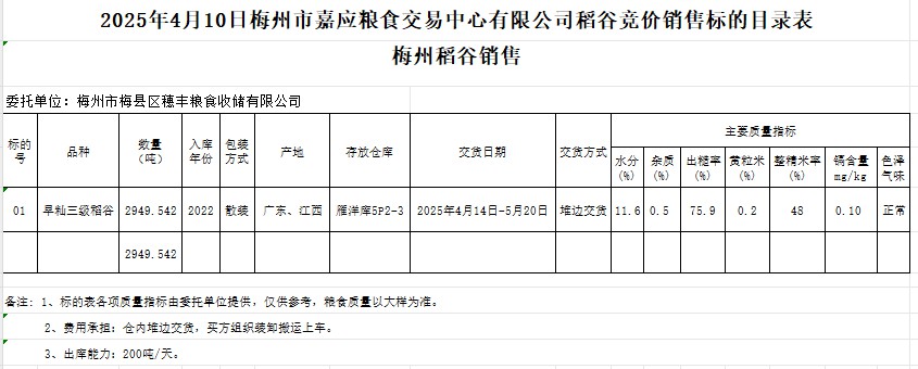 受客戶委托,梅州市嘉應糧食交易中心有限公司定于2025年4月10日(星期四)舉辦糧食競價交易會。梅州市梅縣區穗豐糧食收儲有限公司擬銷售2022年產早秈稻谷2949.542噸。