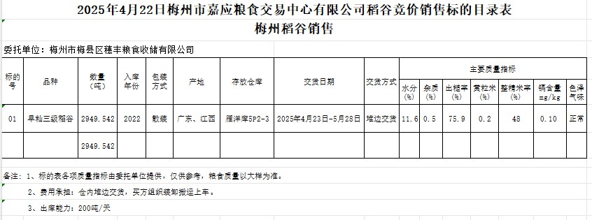 受客戶委托,梅州市嘉應糧食交易中心有限公司定于2025年4月22日(星期二)舉辦糧食競價交易會。梅州市梅縣區穗豐糧食收儲有限公司擬銷售2022年產早秈稻谷2949.542噸。