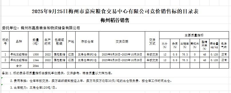受客戶委托,梅州市嘉應糧食交易中心有限公司定于2025年9月25日(星期四)舉辦糧食競價交易會。梅州市嘉泰糧食和物資儲備有限公司擬銷售2022年產早秈稻谷2844噸。