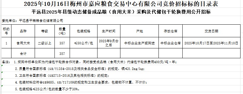 平遠縣2025年縣級動態儲備成品糧(食用大米)采購及代儲包干輪換費用公開招標公告