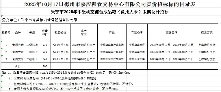 興寧市2025年本級動態(tài)儲備成品糧(食用大米)采購及代儲包干輪換費用公開招標(biāo)公告