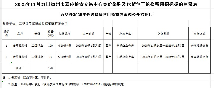五華縣2025年縣級儲備食用植物油采購及代儲包干輪換費用公開招標公告